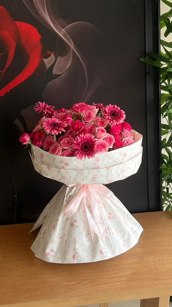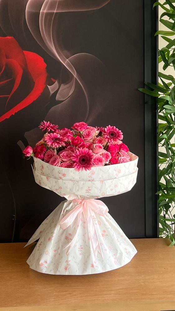 باقة تنبض بالجمال والحيوية، تجمع بين نعومة البيبي روز ورقيّها، وعبق الوري الفاخر، مع لمسة مبهجة من أزهار الجربيرا المشرقة، لتكوّن لوحة فنية تبعث الفرح وتأسِر القلوب