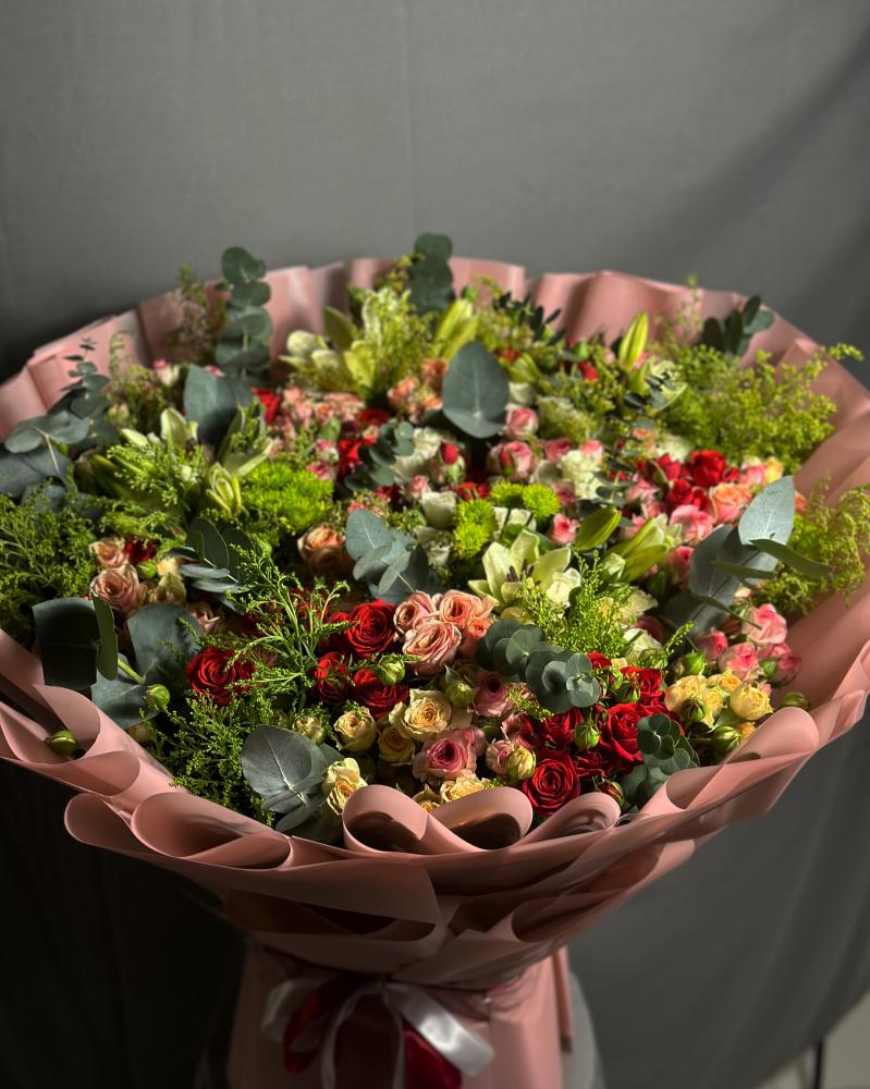 "تألّق مع باقة الورد الطبيعي الكبيرة التي تجمع بين الألوان الزاهية والورود الفاخرة. هذه الباقة مثالية لتكون الهدية الأمثل في أي مناسبة، وتضفي لمسة من الفخامة والجمال تدوم طويلاً."