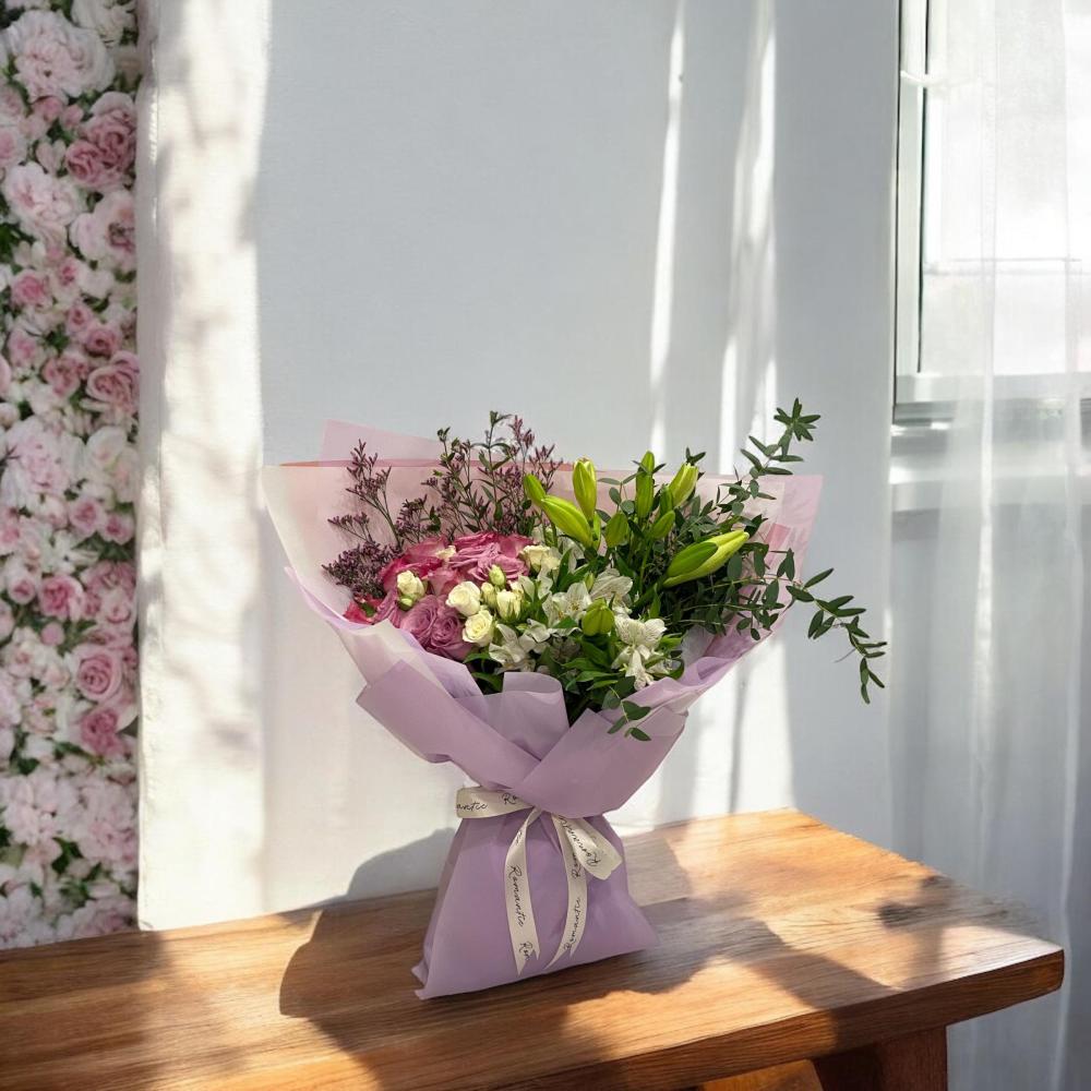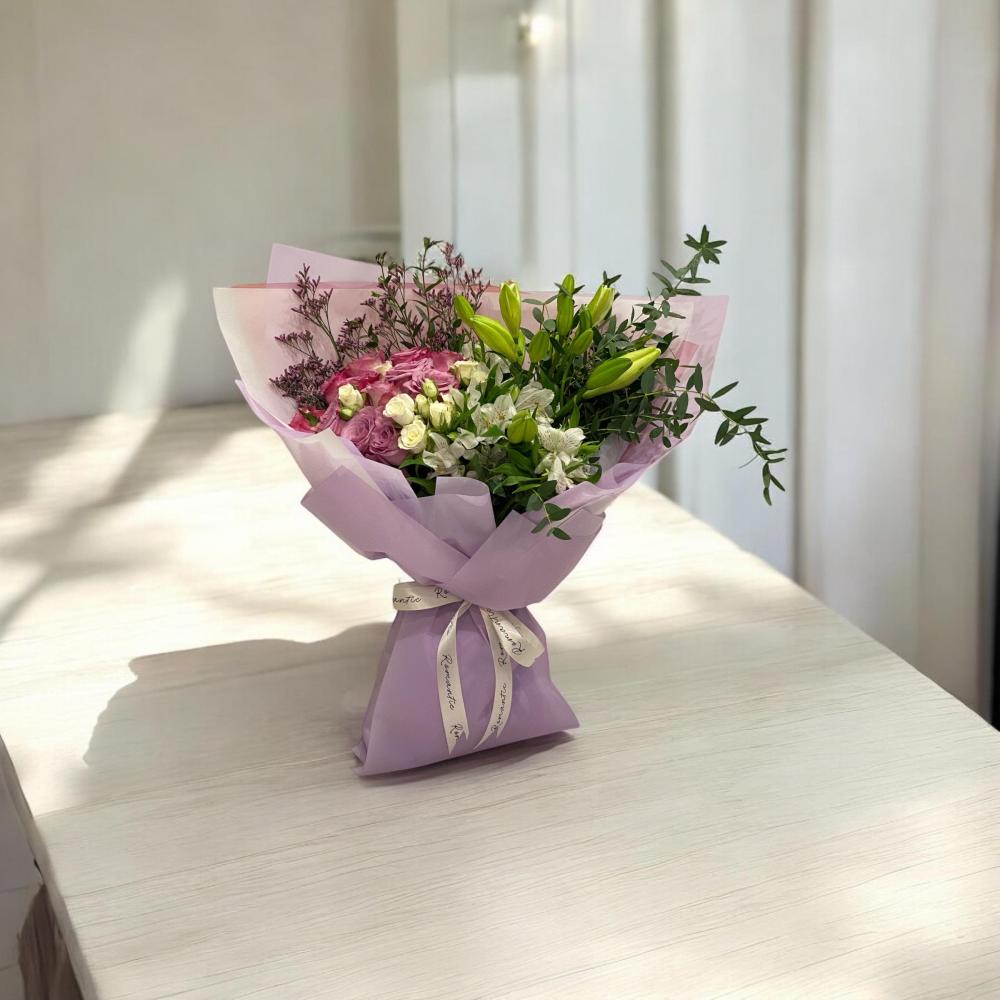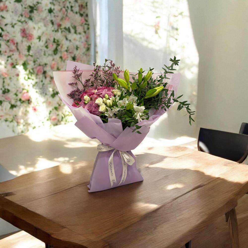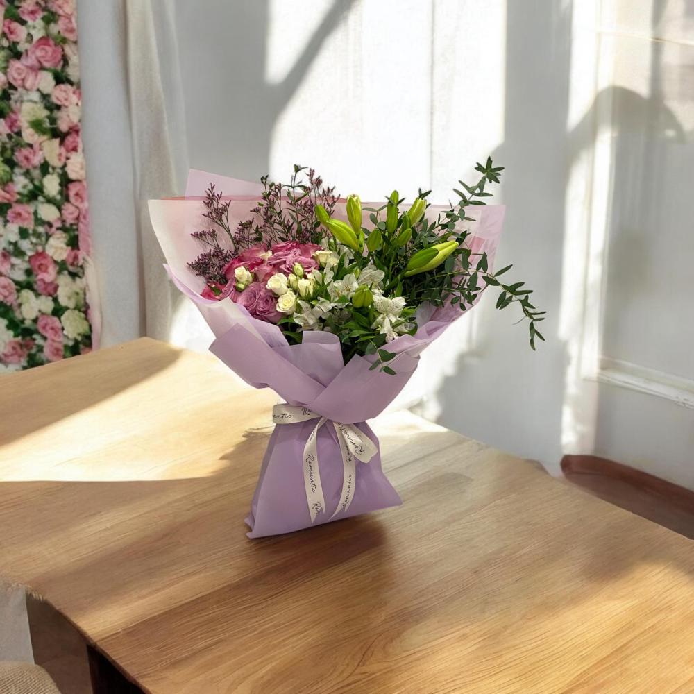 تضم الزهور الوردية المفعمة بالحب و الأبيض الناصع الذي يعكس النقاء، مع لمسات من الاكسسوارات الخضراء التي تضيف حيوية مغلفة بورق بنفسجي ناعم يضيف لمسة من الأناقة و يزيد من جاذبية الباقة.