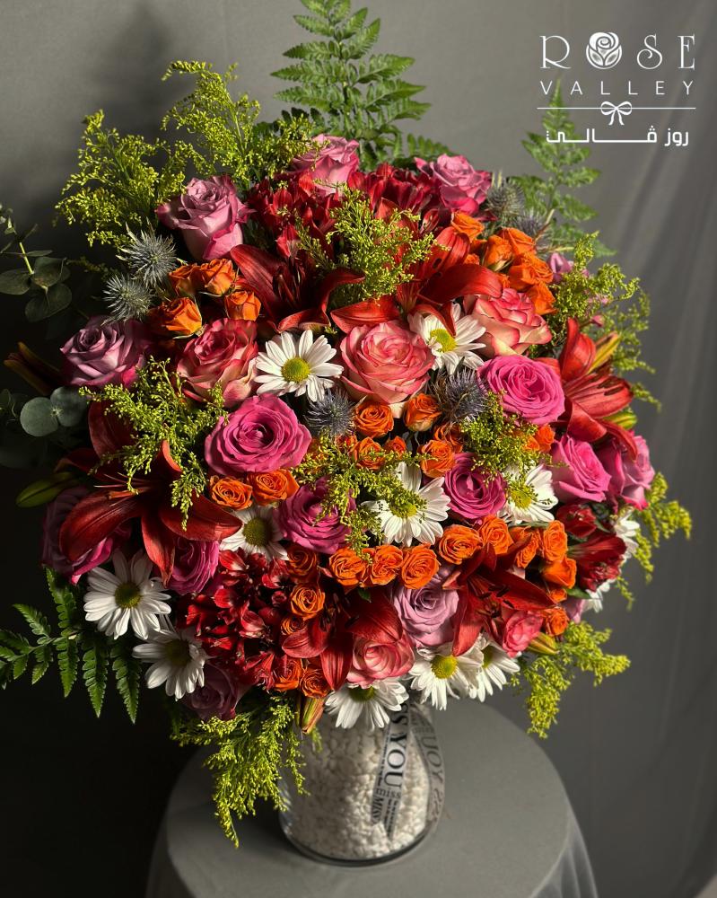 تجمع هذه الفازة الفاخرة بين أجمل أنواع الورود بألوانها الزاهية مثل الأحمر، الوردي، والبرتقالي، مع لمسات من الزهور البيضاء والأوراق الخضراء. هذه الباقة المثالية للتعبير عن مشاعر الحب، الفرح، والتقدير، تُضفي أجواءً من الحيوية والجمال على أي مكان توضع فيه. مثالية للمناسبات الخاصة مثل الأعياد، حفلات الزفاف، وأعياد الميلاد.