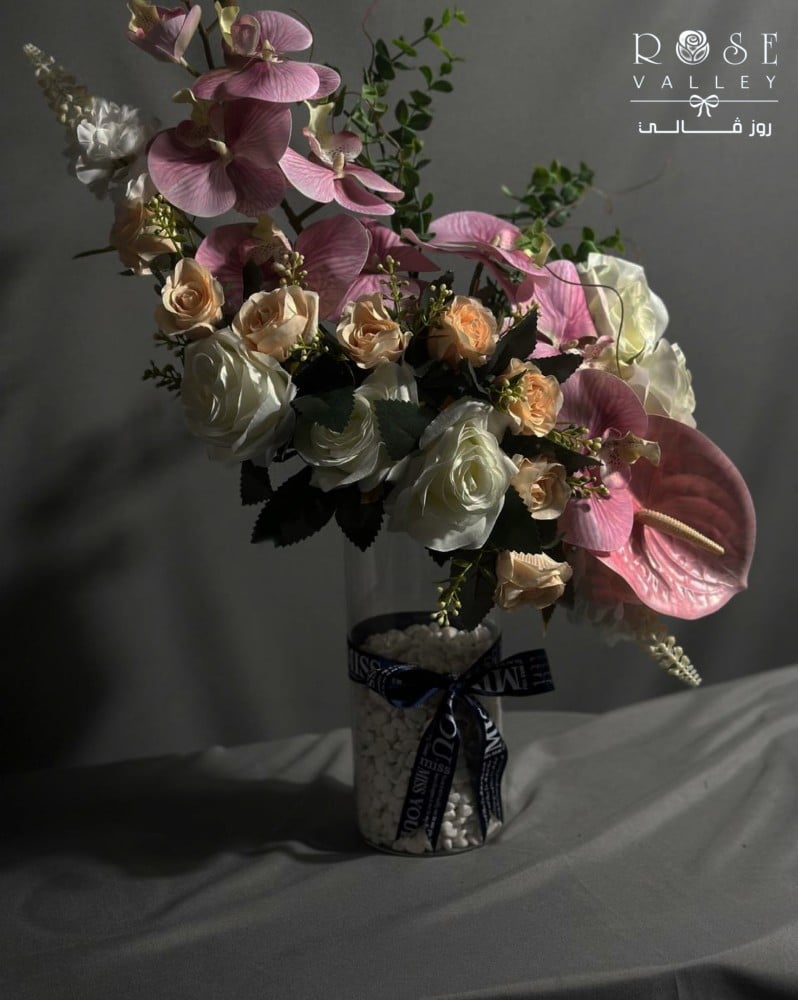 فازة متوسطه شفاف تزيين ورد صناعي وحجر