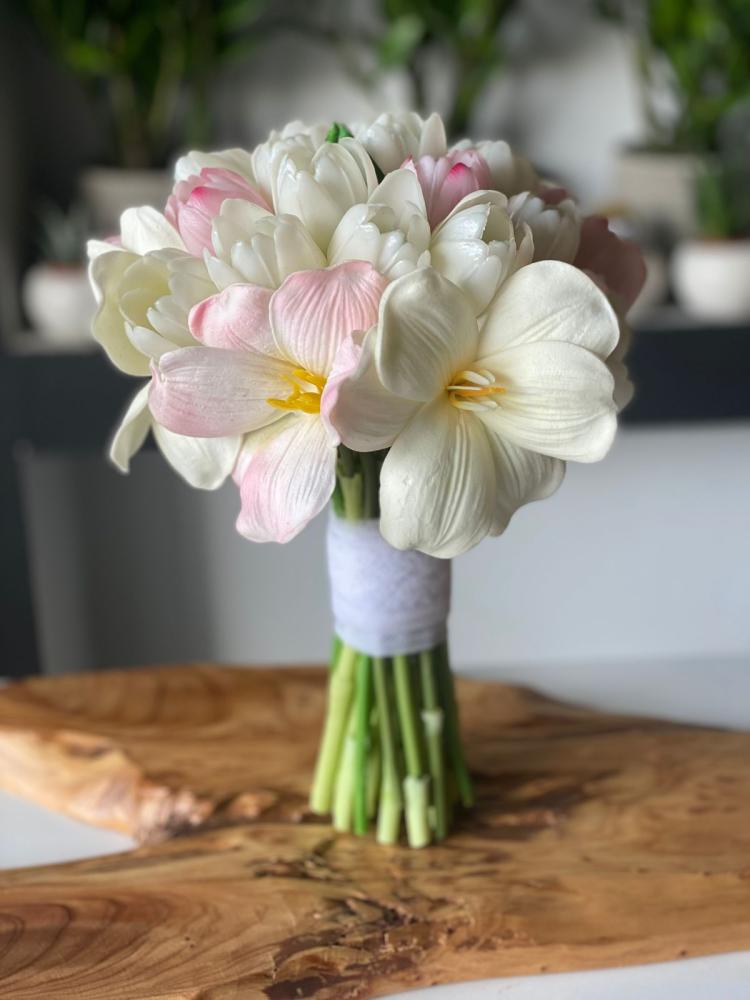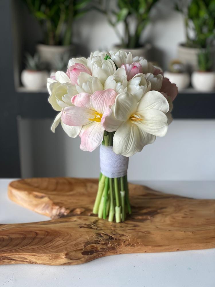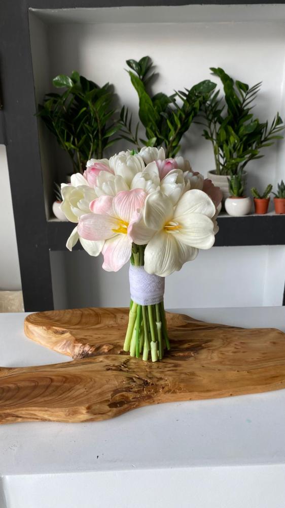 تألقي في يومك المميز مع هذه المسكة الأنيقة التي تجمع بين تدرجات الورود البيضاء والوردية الفاتحة في تنسيق ناعم يعكس الأنوثة والرقي.