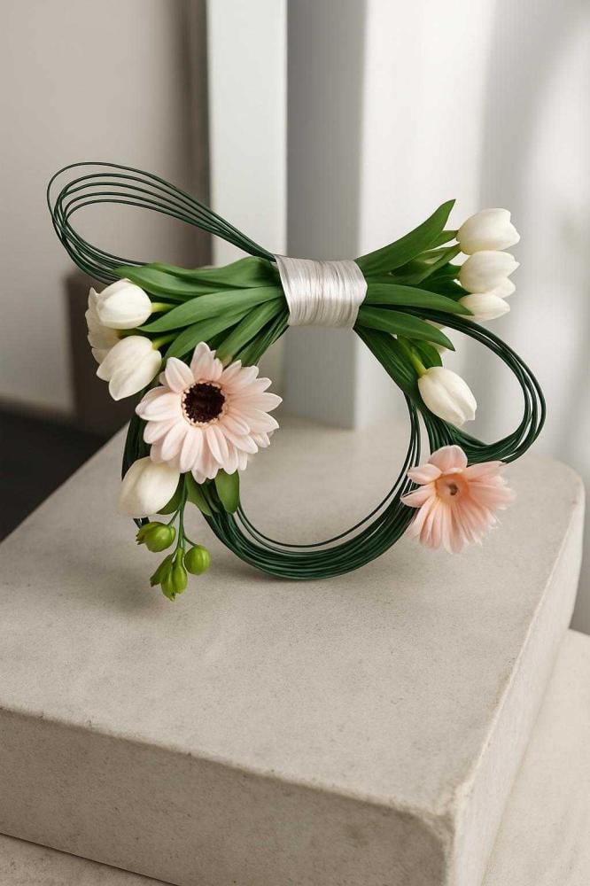 مسكة عروس أنيقة تنبض بالجمال، صُممت بلمسة راقية تجمع بين رقة التوليب وسحر الجاربيرا. التوليب يضفي نعومة وبساطة ملكية، فيما تمنح الجاربيرا حيوية وإشراقة مبهجة. تداخل الأزهار بتناسق ساحر يمنح المسكة لمسة عصرية ورومانسية في آن واحد، لتكون رفيقة مثالية ليوم العروس المميز وتزيدها تألقًا وجاذبية. 🌸✨