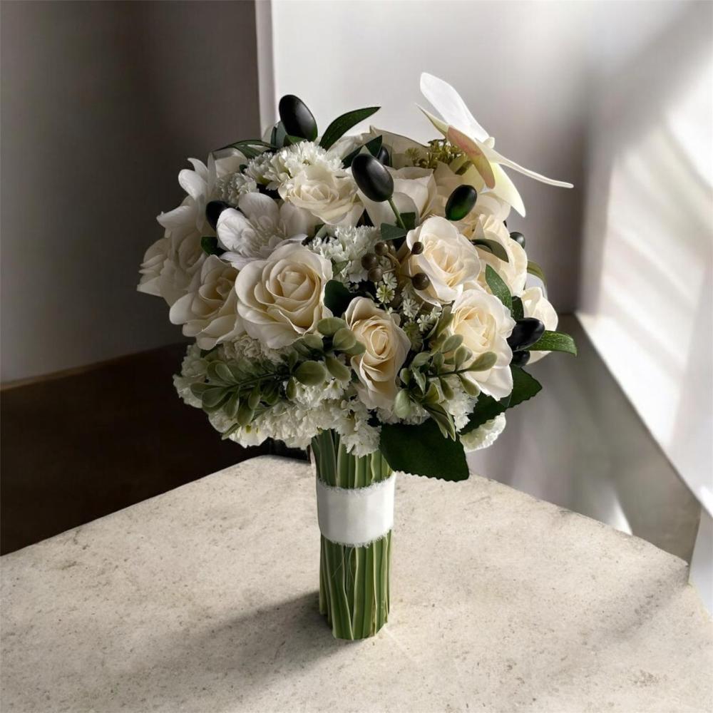 مسكة كلاسيكية فاخرة تجمع بين ورود بيضاء نقيّة ترمز للطهارة والبدايات الجديدة. تنسّق الورود بشكل دائري أو انسيابي لتضفي لمسة من الرقيّ والهدوء، مع تفاصيل خضراء خفيفة تزيدها إشراقًا طبيعيًا. يلفّ المقبض بشريط ساتان أبيض أو عاجي ليكمل جمال المسكة بأسلوب راقٍ وبسيط.