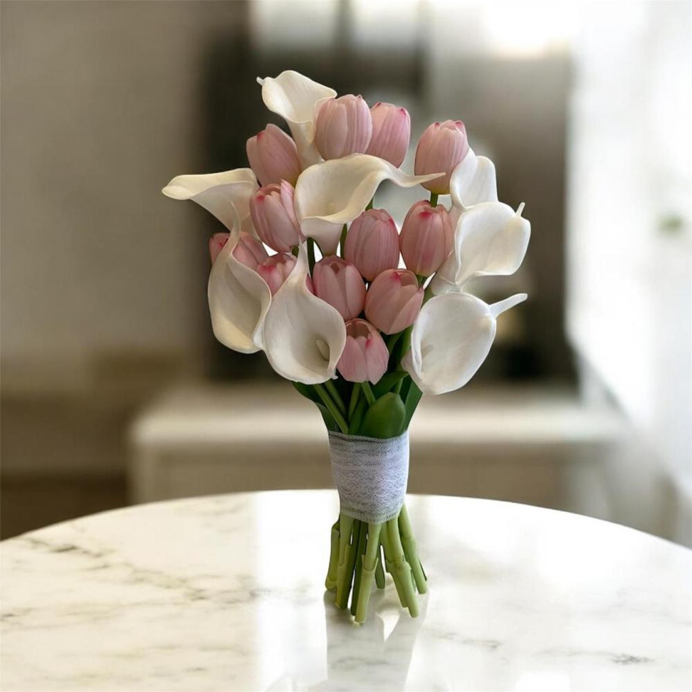 مسكة عروسة راقية تجمع بين جمال التوليب الناعم ورقته الساحرة، مع فخامة زهرة الكالا التي تضيف لمسة عصرية وأنيقة. تنسيق يفيض بالرقي والبساطة الملكية، لتكون المسكة اختيارًا مثاليًا لكل عروس تبحث عن التميز في يومها الكبير. 💍✨�
